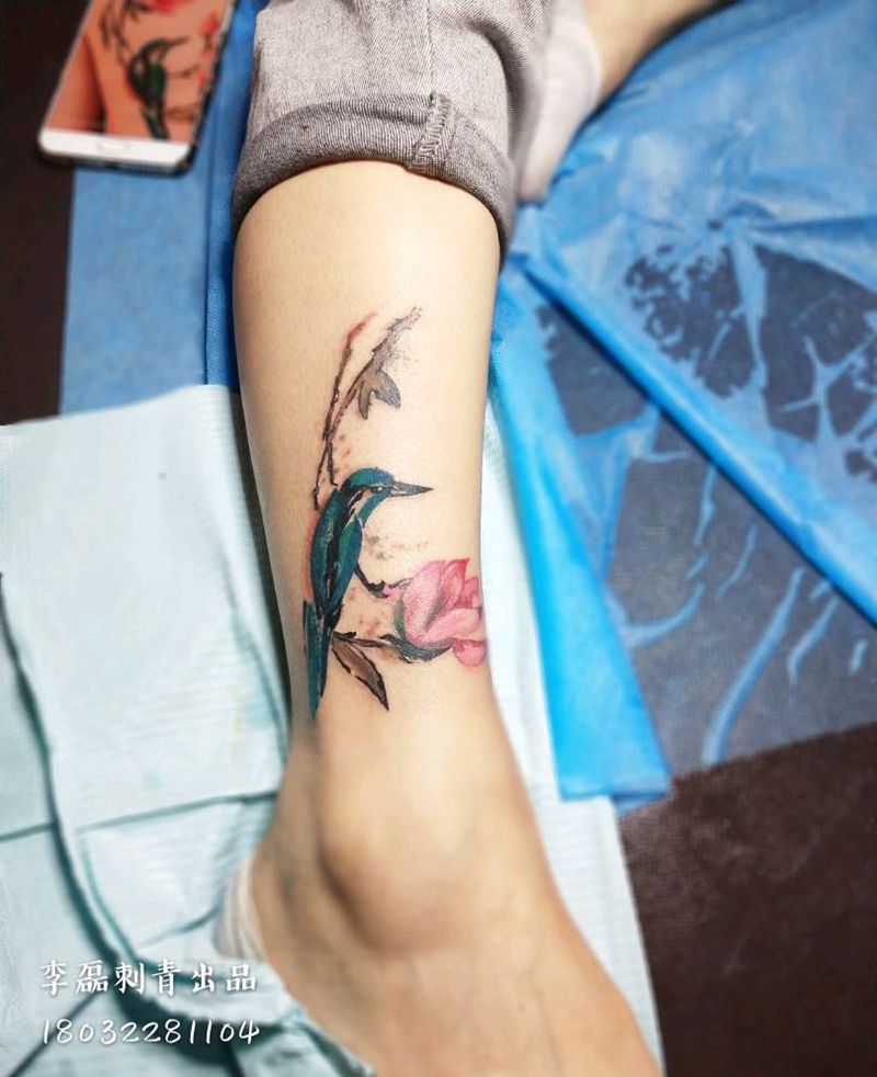 当前位置: 首页 >河北省石家庄市纹身店-李磊刺青会所纹身图案>鸟语花香纹身图片_腿部清新动物植物成品纹身图案