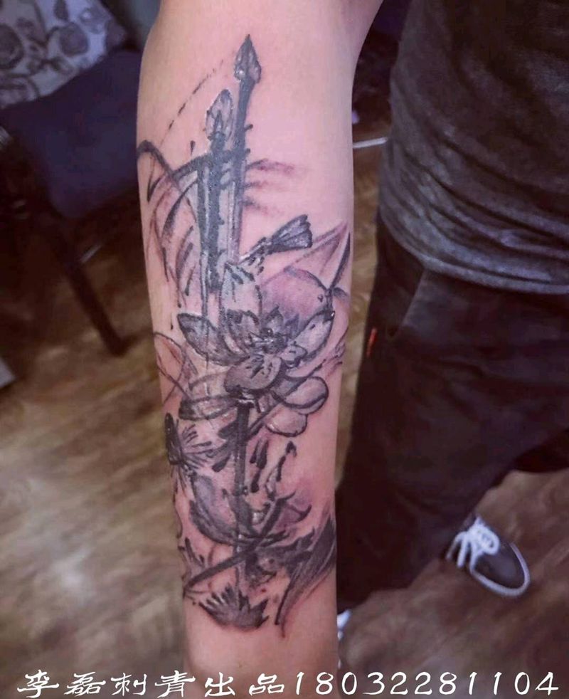当前位置: 首页 >河北省石家庄市纹身店-李磊刺青会所纹身图案>水墨荷花纹身图片_手臂清新植物纹身图案