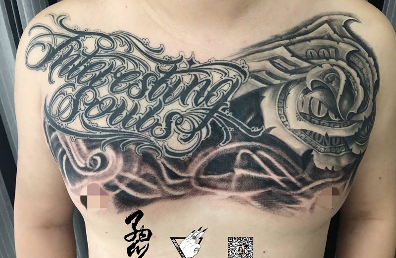 有趣的灵魂与财富纹身图片_胸部New School花体字原创纹身图案