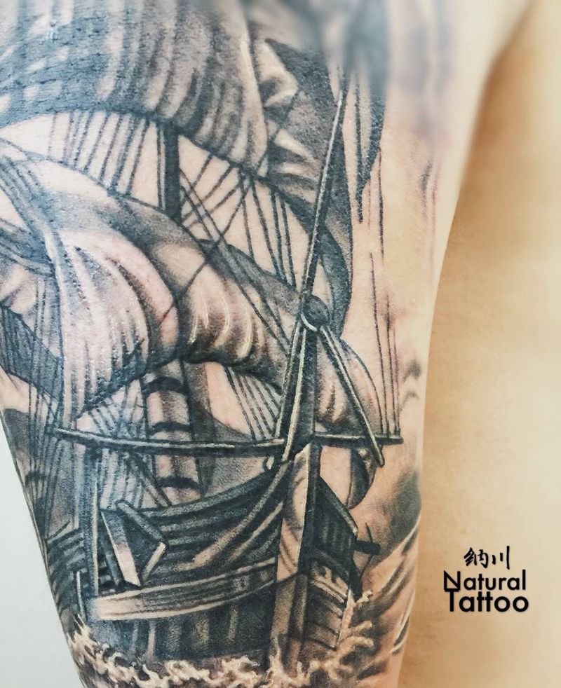 当前位置: 首页 >河北省石家庄市纹身店-纳川刺青Natural Tattoo纹身图案>帆船遮盖纹身图片_成品手臂欧美写实遮盖纹身图案
