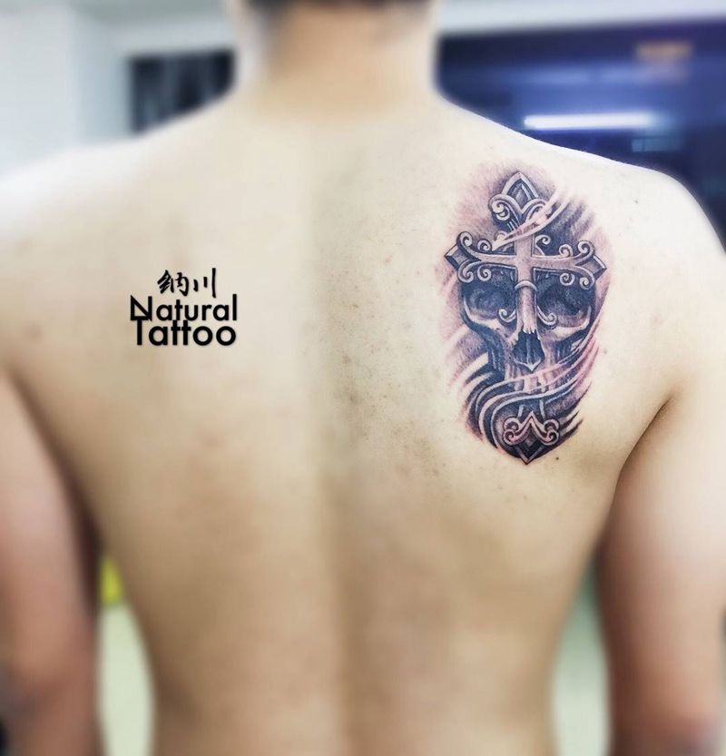 当前位置: 首页 >河北省石家庄市纹身店-纳川刺青Natural Tattoo纹身图案>骷髅十字架纹身图片_成品背部欧美写实鬼神静物宗教黑白纹身图案