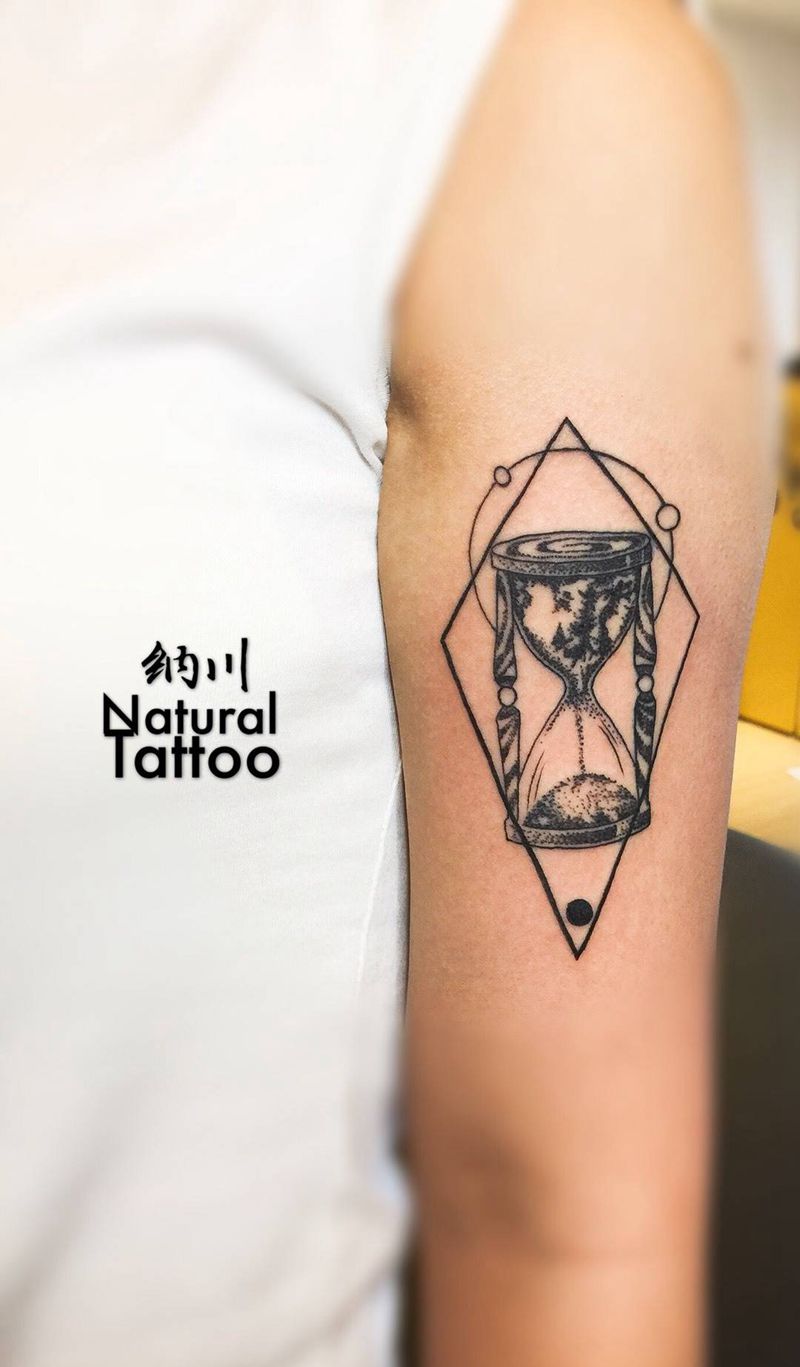 当前位置: 首页 >河北省石家庄市纹身店-纳川刺青Natural Tattoo纹身图案>沙漏纹身图片_成品手臂欧美点刺清新静物纹身图案