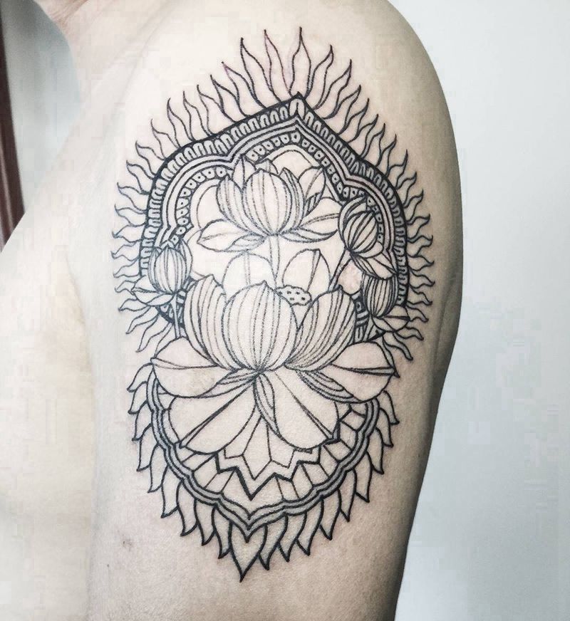 当前位置: 首页 >河北省石家庄市纹身店-纳川刺青Natural Tattoo纹身图案>图腾莲花纹身图片_成品手臂肩部欧美清新植物图腾纹身图案