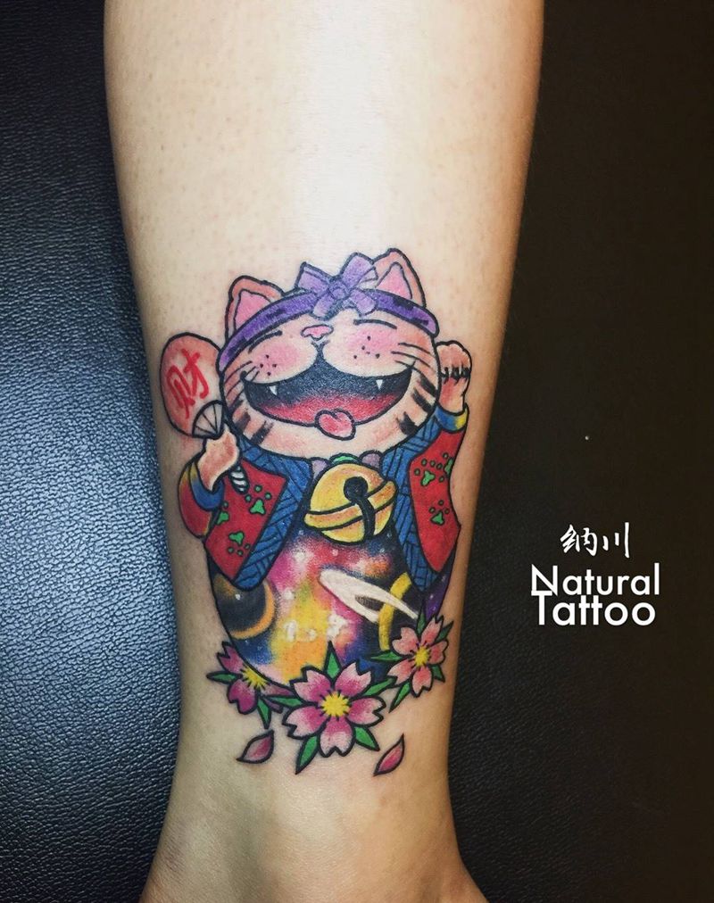 招财猫呜纹身图片_成品腿部欧美传统动物鬼神卡通纹身图案