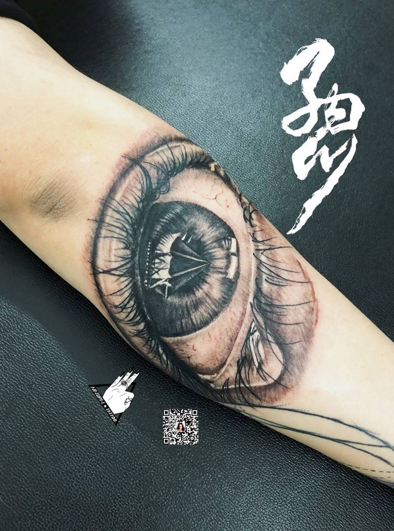 按照客人的要求眼睛里纹身图片_手臂New School欧美写实黑白文身纹身图案