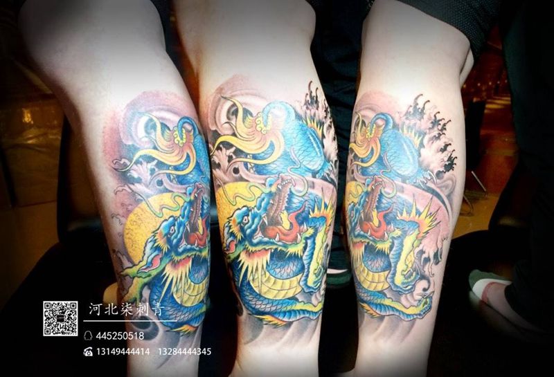 • T网红王老大花腿龙纹身图片_腿部新传统纹身图案