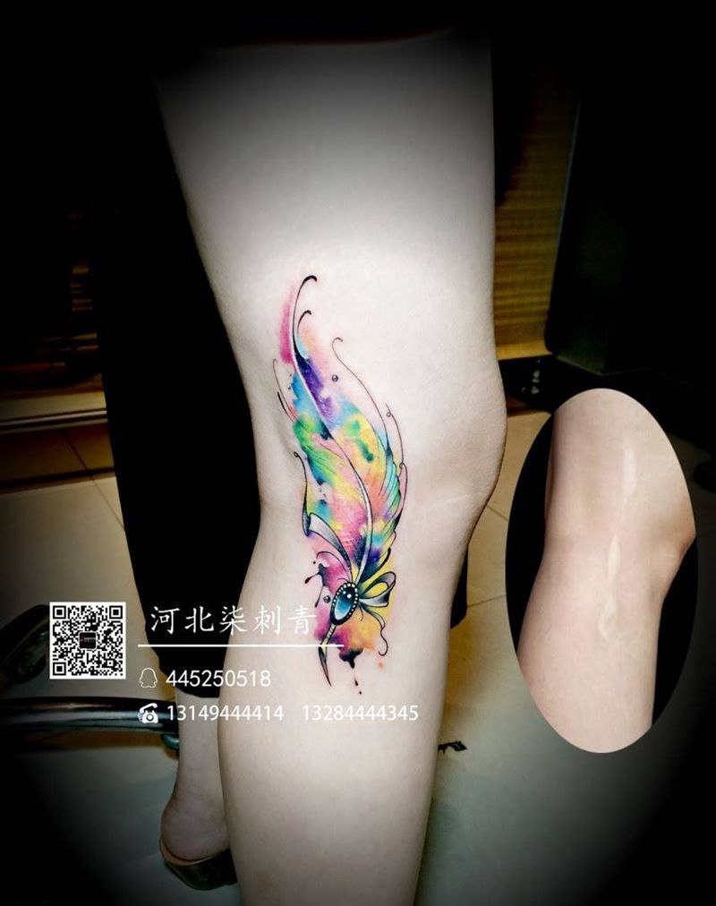 当前位置: 首页 >河北省石家庄市纹身店-柒刺青纹身纹身图案>水彩羽毛遮盖疤纹身图片_成品腿部清新静物原创纹身图案