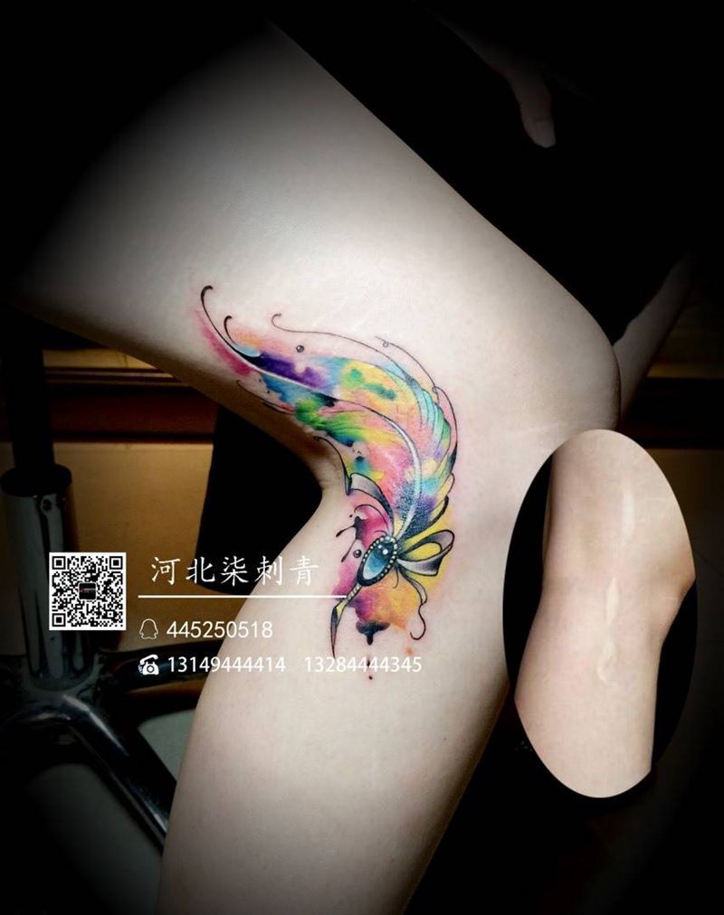 当前位置: 首页 >河北省石家庄市纹身店-柒刺青纹身纹身图案>水彩羽毛遮盖疤纹身图片_成品腿部清新静物原创纹身图案