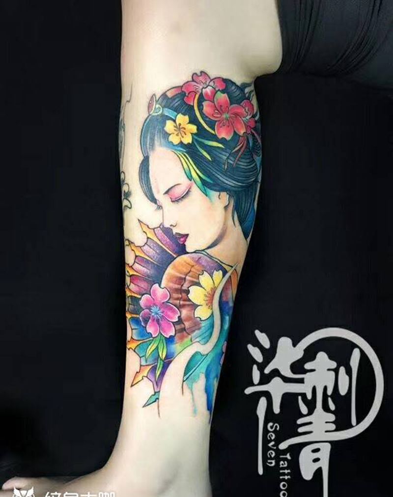 当前位置: 首页 >河北省石家庄市纹身店-柒刺青纹身纹身图案>古典美女纹身图片_成品腿部肖像传统人物纹身图案