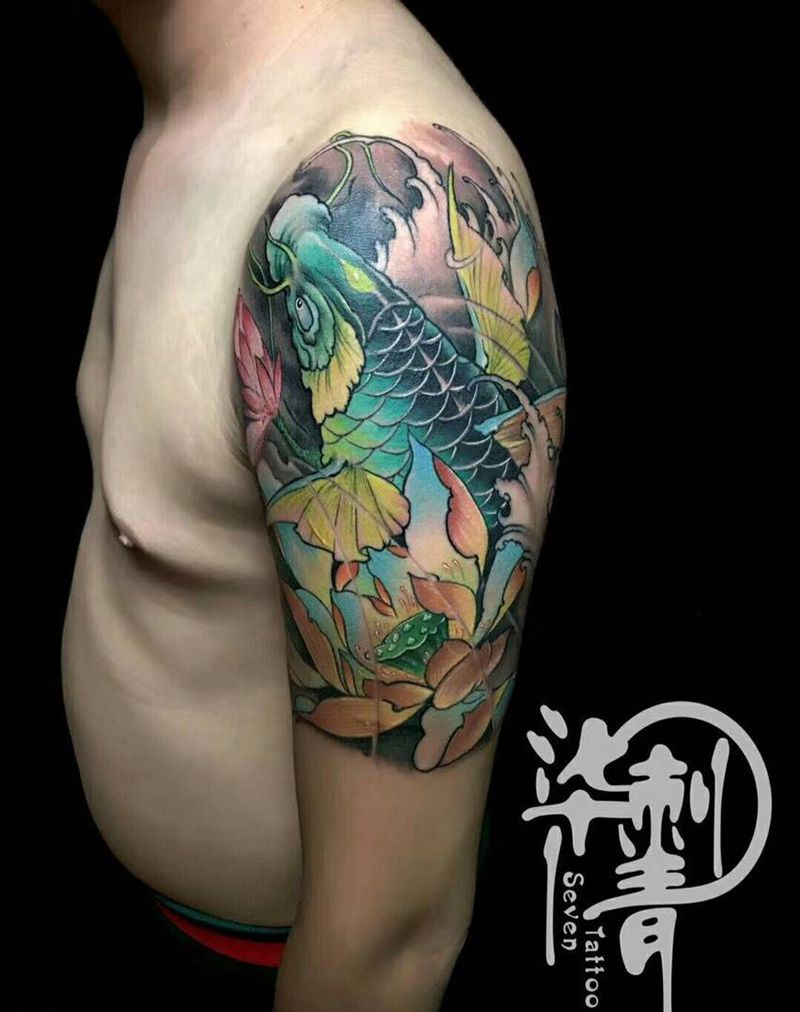 当前位置: 首页 >河北省石家庄市纹身店-柒刺青纹身纹身图案>彩色锦鲤纹身图片_成品手臂肩部传统清新动物纹身图案