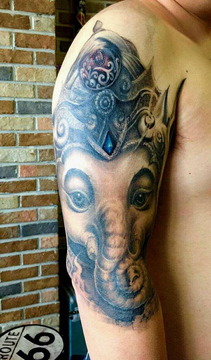 当前位置: 首页 >河北省石家庄市纹身店-指墨刺青纹身图案>遮盖大臂象神纹身图片
