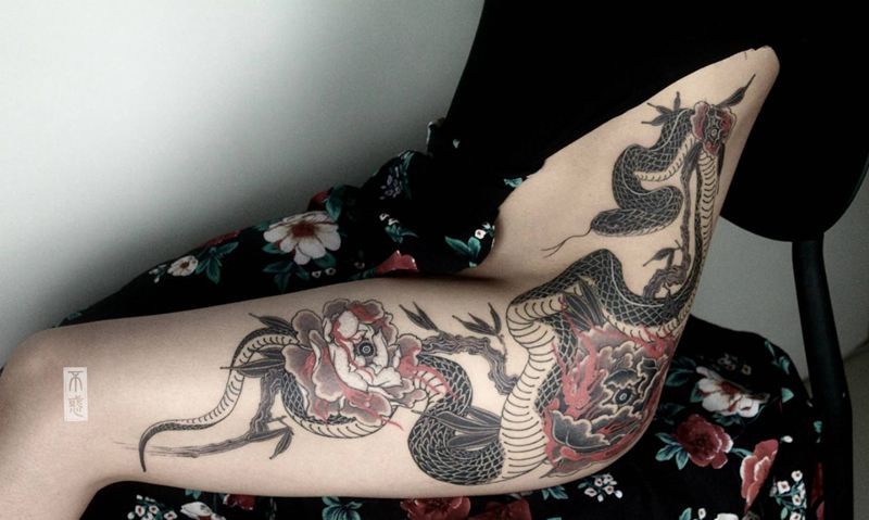 • T网红王老大花腿龙纹身图片_腿部新传统纹身图案