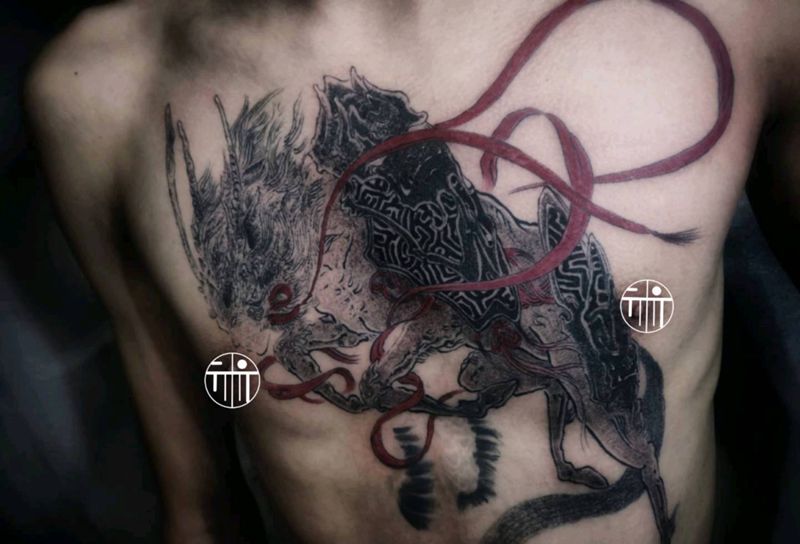 人面马身神纹身图片_胸部老传统新传统山海经纹身图案