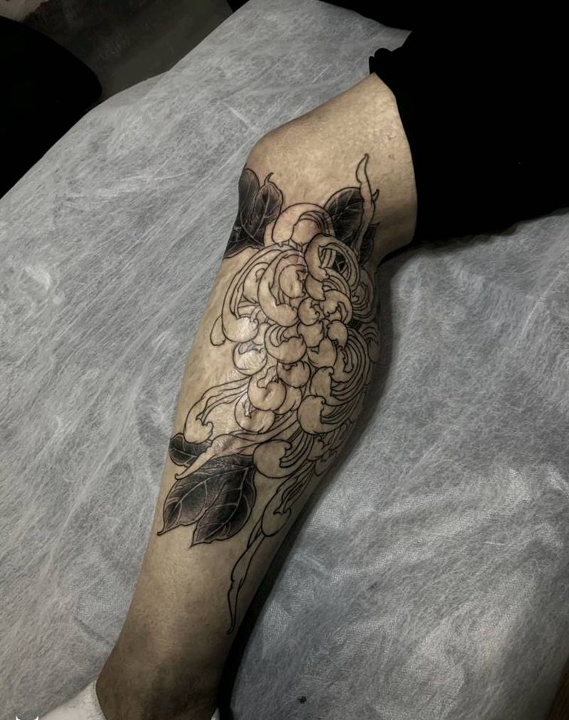 蓝菊[疤痕遮盖未完]纹身图片_腿部新传统菊花纹身图案