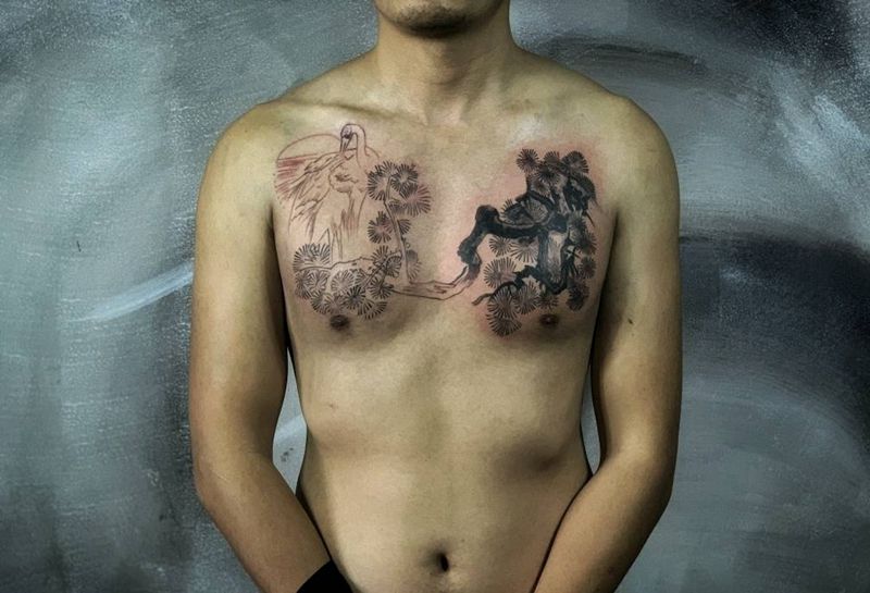 松与鹤纹身图片_胸部水墨鹤仙鹤纹身图案
