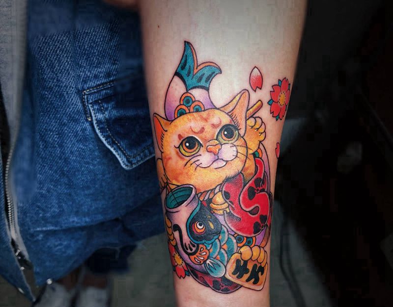 招财猫纹身图片_手臂新传统招财猫纹身图案