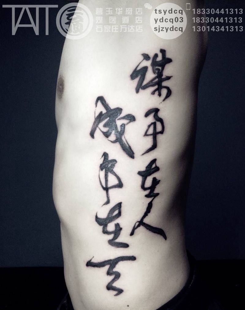 当前位置: 首页 >河北省唐山市纹身店-云顶刺青纹身图案>中文书法字体纹身图片_成品腰部传统写实国画字符原创图腾纹身图案