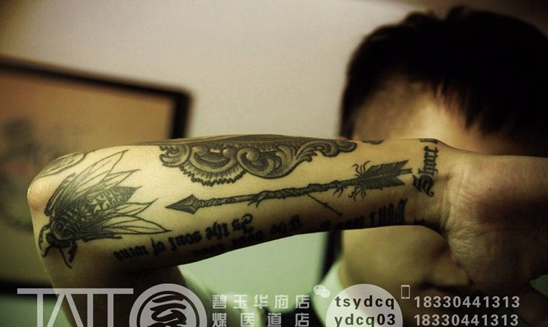 炫酷欧美花臂拼接纹身图片_成品手臂欧美字符几何原创静物动物植物纹身图案