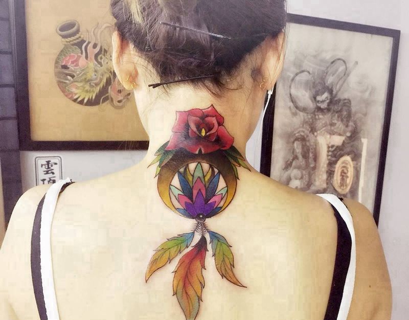 当前位置: 首页 >河北省唐山市纹身店-云顶刺青纹身图案>捕梦网遮盖老纹身纹身图片_成品颈部欧美习俗静物植物原创纹身图案