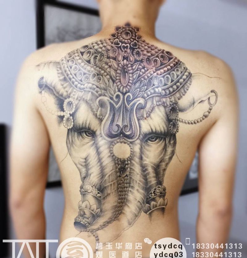 写实风格象神纹身图片_成品背部传统写实动物鬼神原创纹身图案