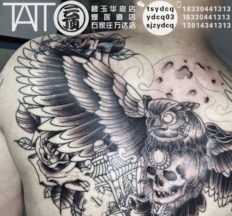 猫头鹰 未完待续纹身图片_成品背部欧美原创动物植物纹身图案