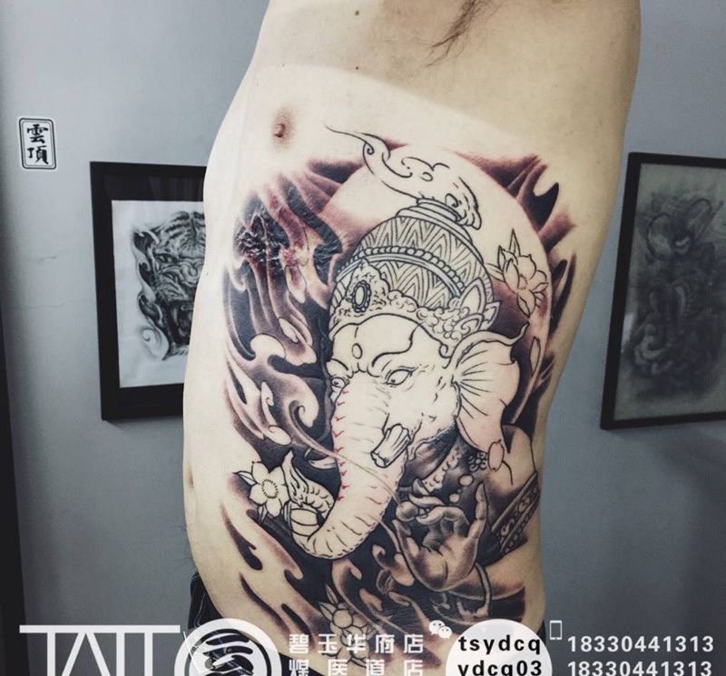 当前位置: 首页 >河北省唐山市纹身店-云顶刺青纹身图案>象神疤痕覆盖纹身图片_成品腰部传统习俗鬼神动物宗教原创纹身图案