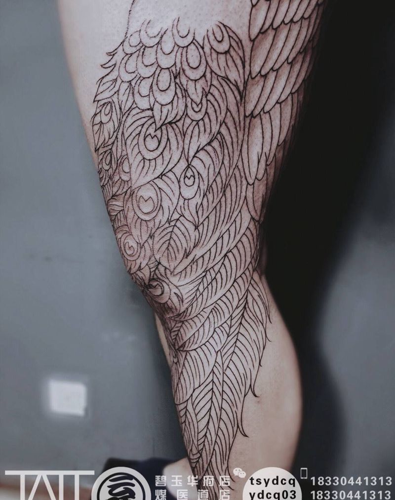 孔雀 割线完成纹身图片_成品腿部传统动物原创纹身图案