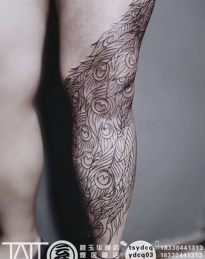 孔雀 割线完成纹身图片_成品腿部传统动物原创纹身图案