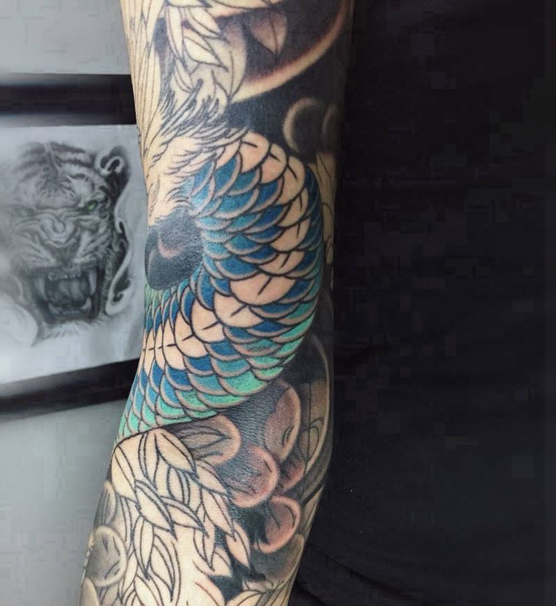 • T网红王老大花腿龙纹身图片_腿部新传统纹身图案