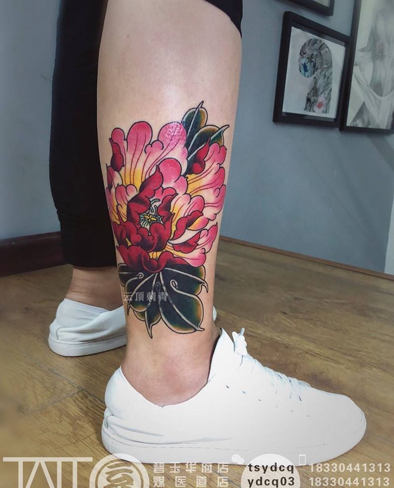 牡丹 老纹身覆盖纹身图片_成品腿部传统国画静物原创植物纹身图案