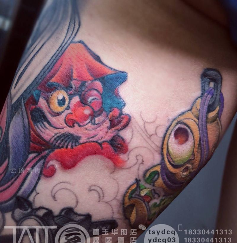 传统花臂拼接纹身图片_成品腿部传统习俗宗教鬼神原创纹身图案