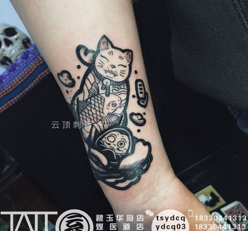 招财猫纹身图片_手臂New School招财猫纹身图案