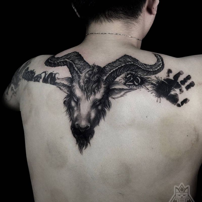 当前位置: 首页 >河北省石家庄市纹身店-石门刺客纹身纹身图案>守护羊头纹身图片_成品背部欧美写实动物静物羊头纹身图案