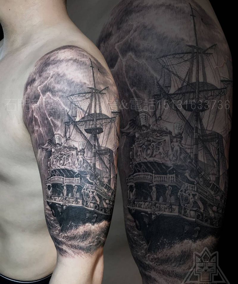 当前位置: 首页 >河北省石家庄市纹身店-石门刺客纹身纹身图案>大船纹身图片_成品手臂欧美写实帆船纹身图案