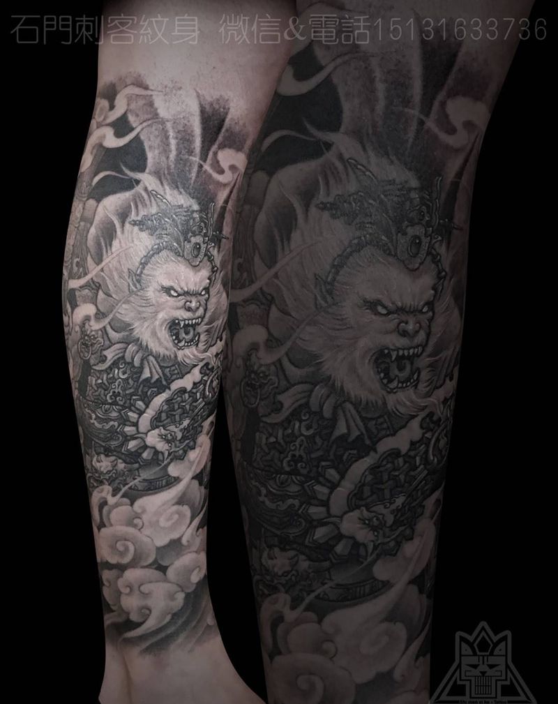 大圣之战纹身图片_成品腿部写实传统肖像鬼神宗教原创孙悟空纹身图案