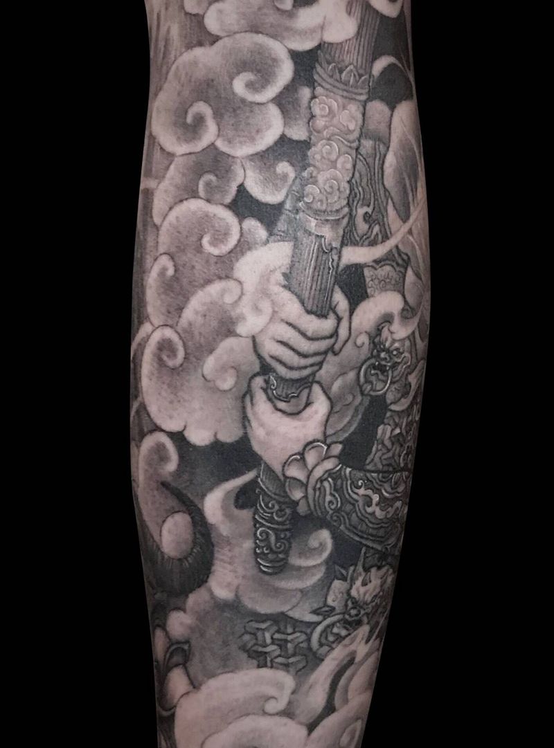 当前位置: 首页 >河北省石家庄市纹身店-石门刺客纹身纹身图案>大圣之战纹身图片_成品腿部写实传统肖像鬼神宗教原创孙悟空纹身图案