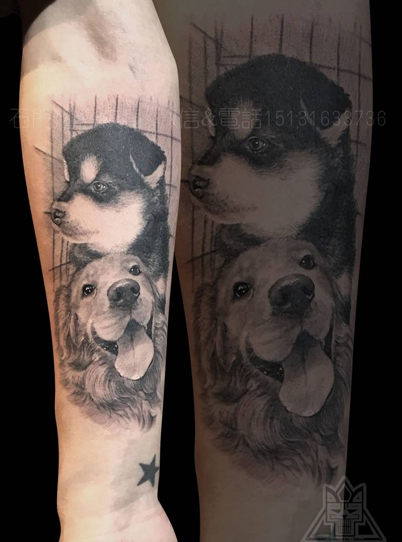 小阿拉与大金毛纹身图片_成品手臂欧美写实肖像动物纹身图案