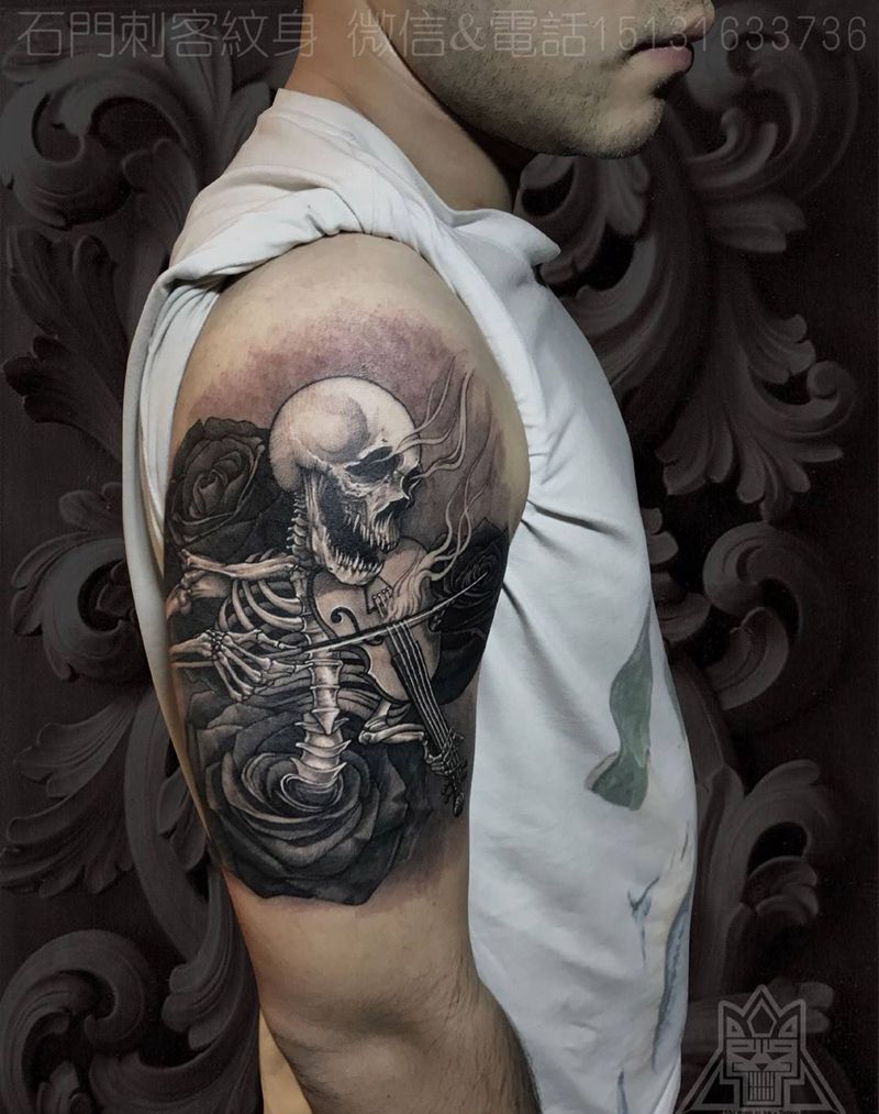 当前位置: 首页 >河北省石家庄市纹身店-石门刺客纹身纹身图案>骷髅提琴纹身图片_手臂欧美写实骷髅玫瑰小提琴纹身图案