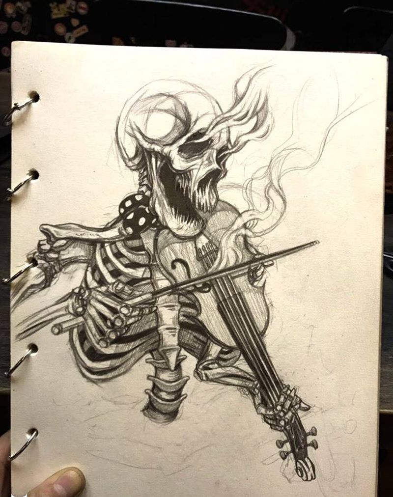 骷髅提琴纹身图片_手臂欧美写实骷髅玫瑰小提琴纹身图案