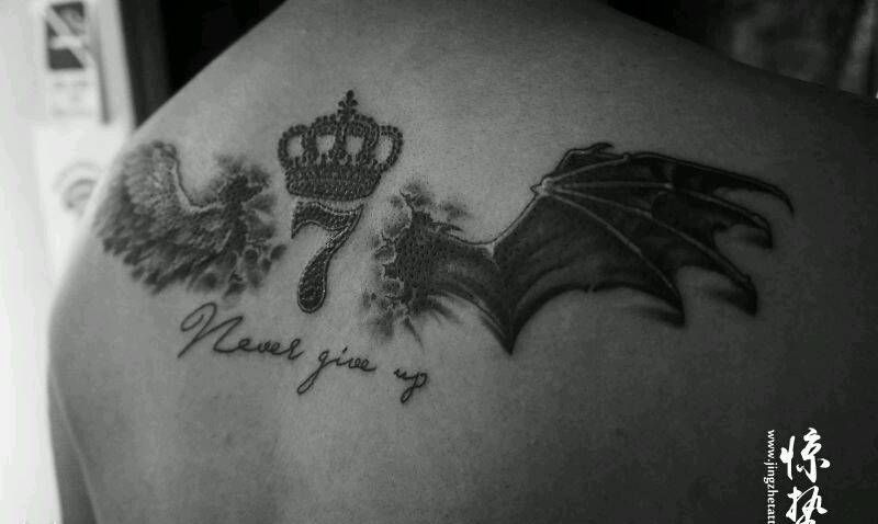 天使与恶魔同在纹身图片_背部欧美写实原创唐山惊蛰成品纹身图案