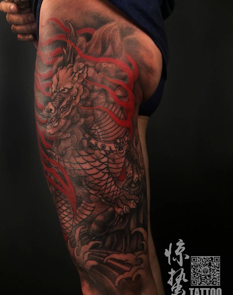 当前位置: 首页 >河北省唐山市纹身店-惊蛰刺青纹身图案>火麒麟纹身图片_成品传统腿部原创鬼神惊蛰刺青纹身图案