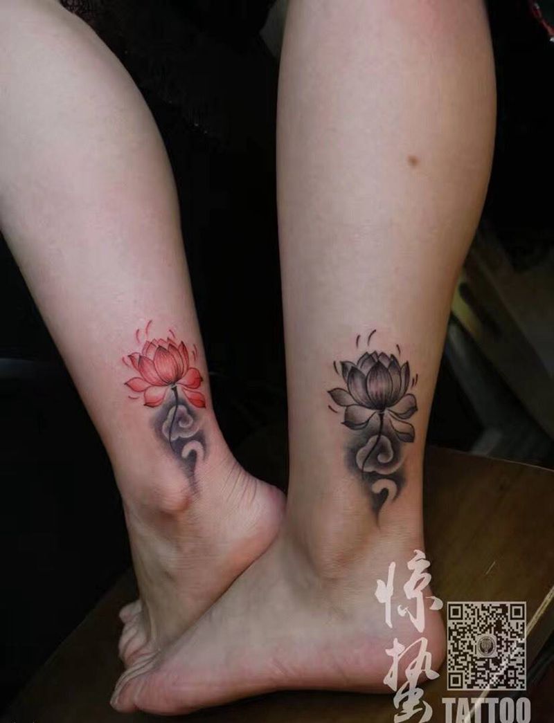 当前位置: 首页 >河北省唐山市纹身店-惊蛰刺青纹身图案>闺蜜莲花纹身图片_成品脚部腿部清新植物纹身图案