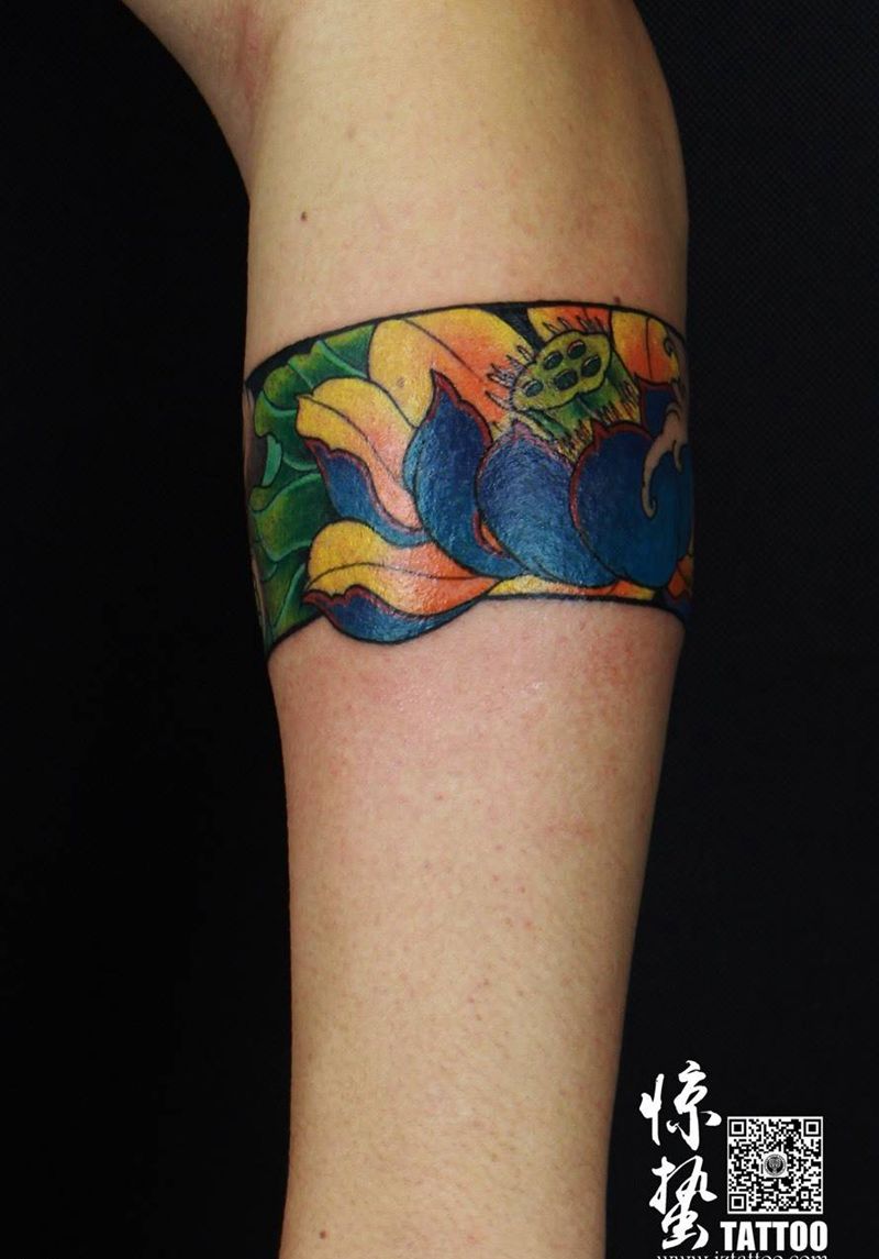荷花水浪臂环——付浩纹身图片_成品手臂清新传统植物原创惊蛰刺青纹身图案