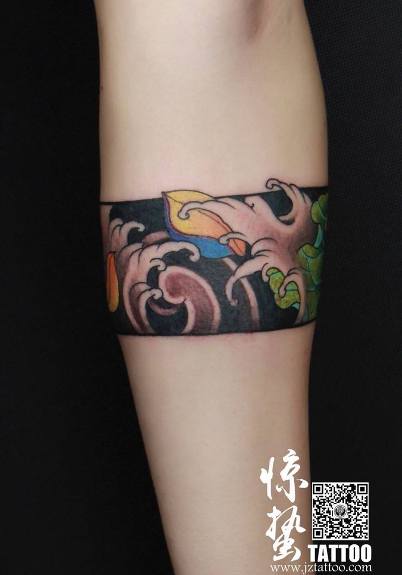 荷花水浪臂环——付浩纹身图片_成品手臂清新传统植物原创惊蛰刺青纹身图案