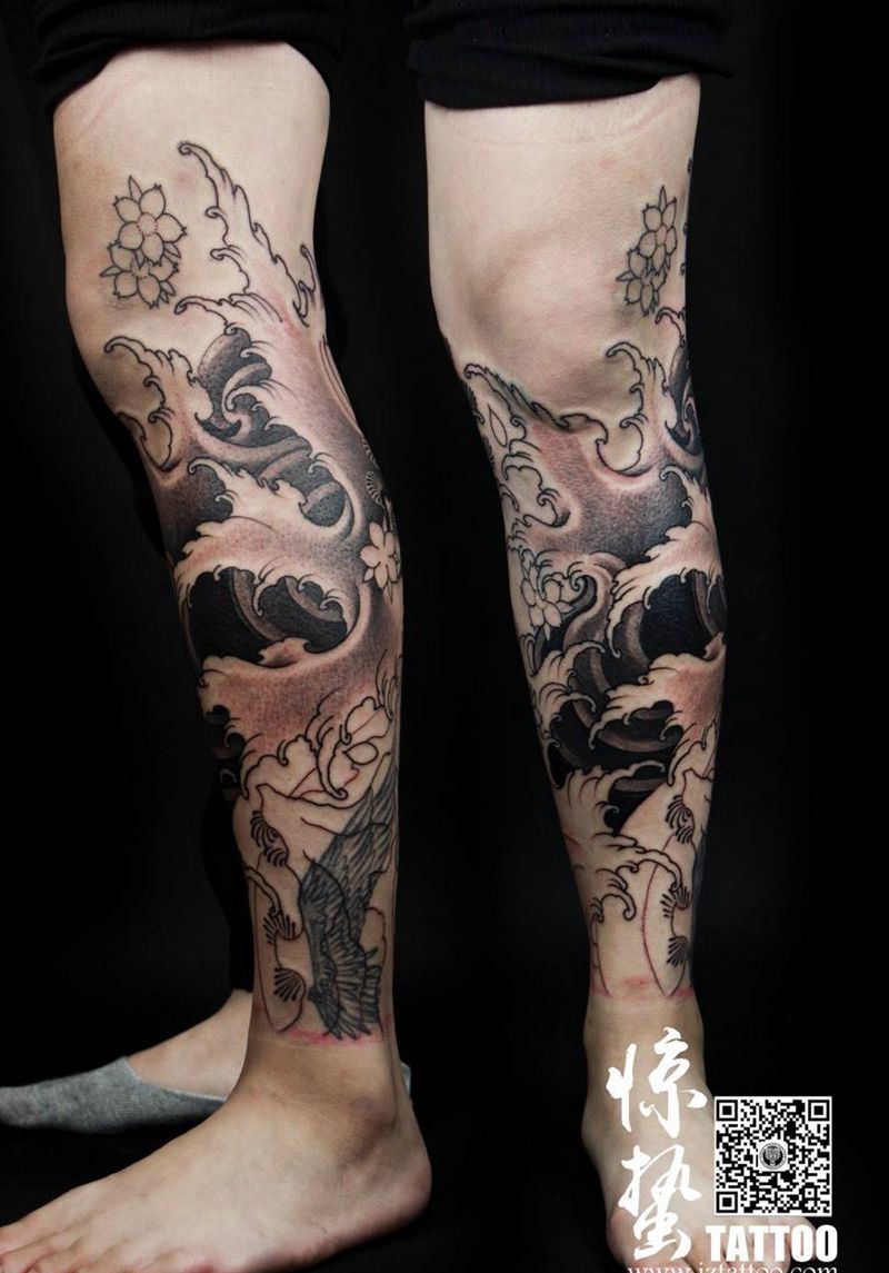 小腿水浪未完纹身图片_成品腿部传统原创惊蛰刺青纹身图案