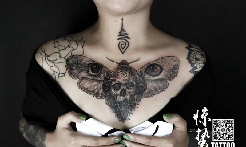 原创死亡蛾纹身图片_成品胸部写实原创惊蛰刺青纹身图案
