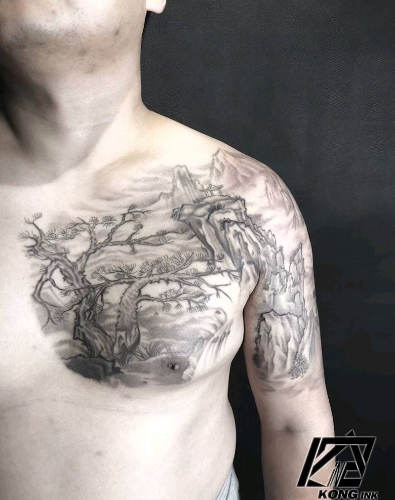 水墨山石纹身图片_手臂胸部水墨纹身图案