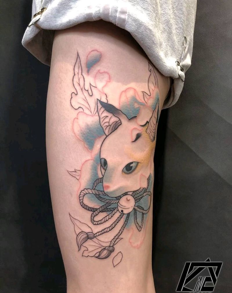 大腿猫咪纹身图片_腿部新传统水彩纹身图案