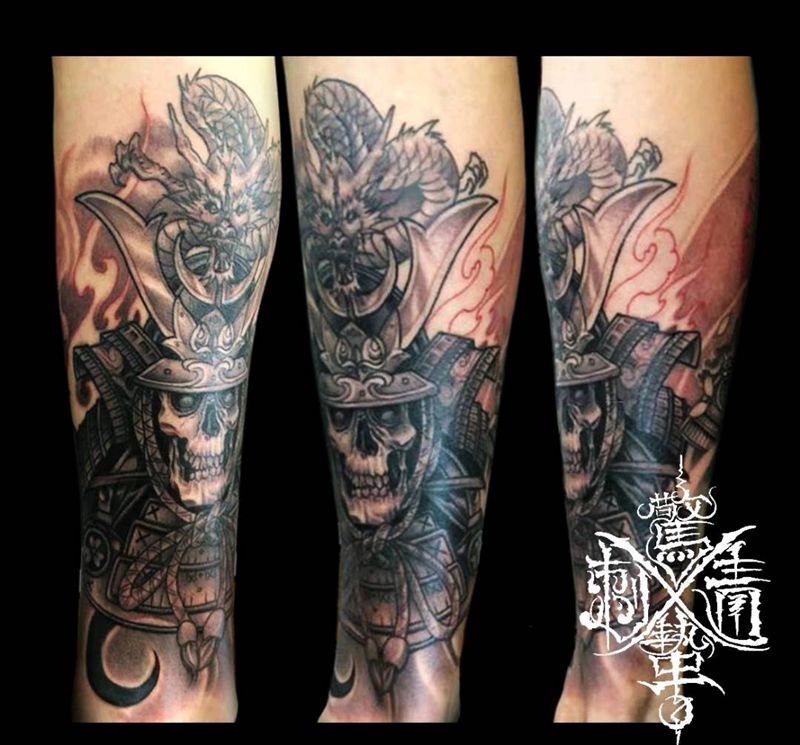 当前位置: 首页 >河北省唐山市纹身店-惊蛰刺青纹身图案>小腿鬼武士纹身图片_腿部新传统欧美写实纹身图案