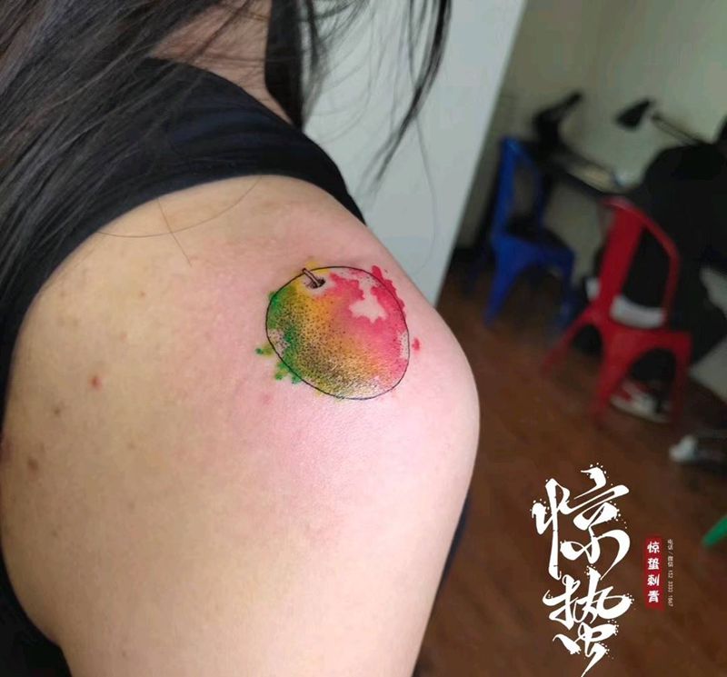 当前位置: 首页 >河北省唐山市纹身店-惊蛰刺青纹身图案>肩头水彩小苹果纹身图片_肩部水彩纹身图案